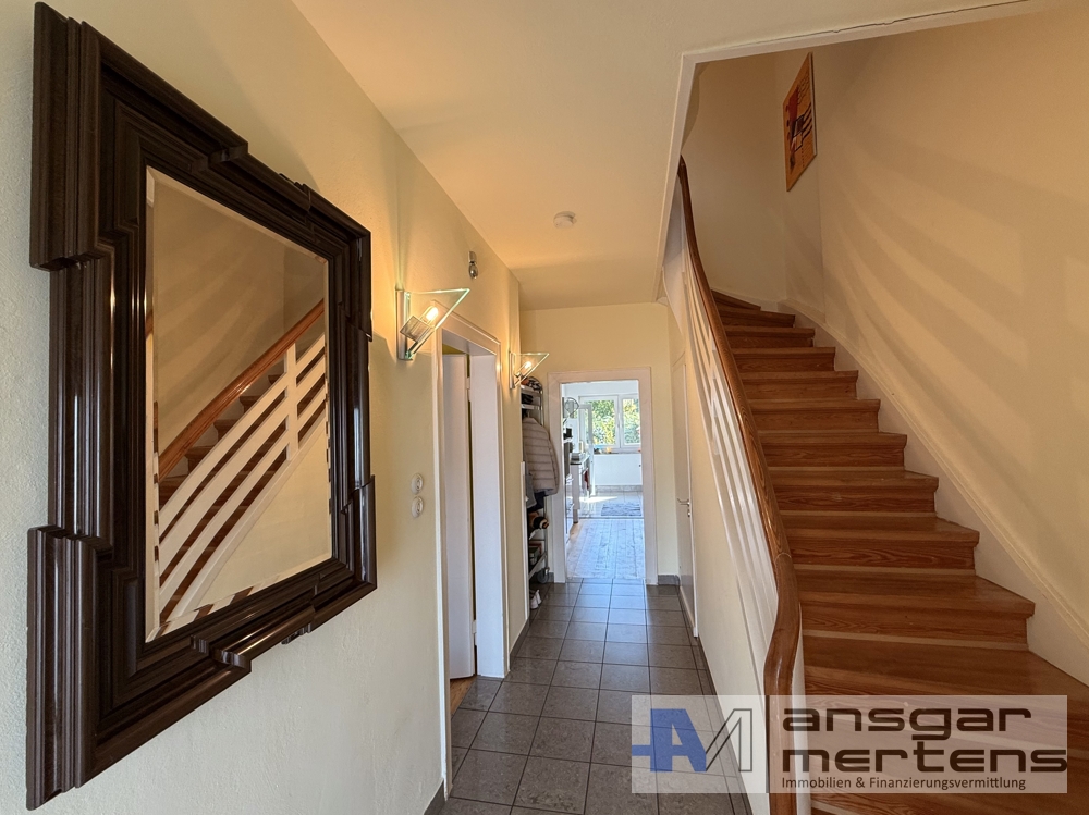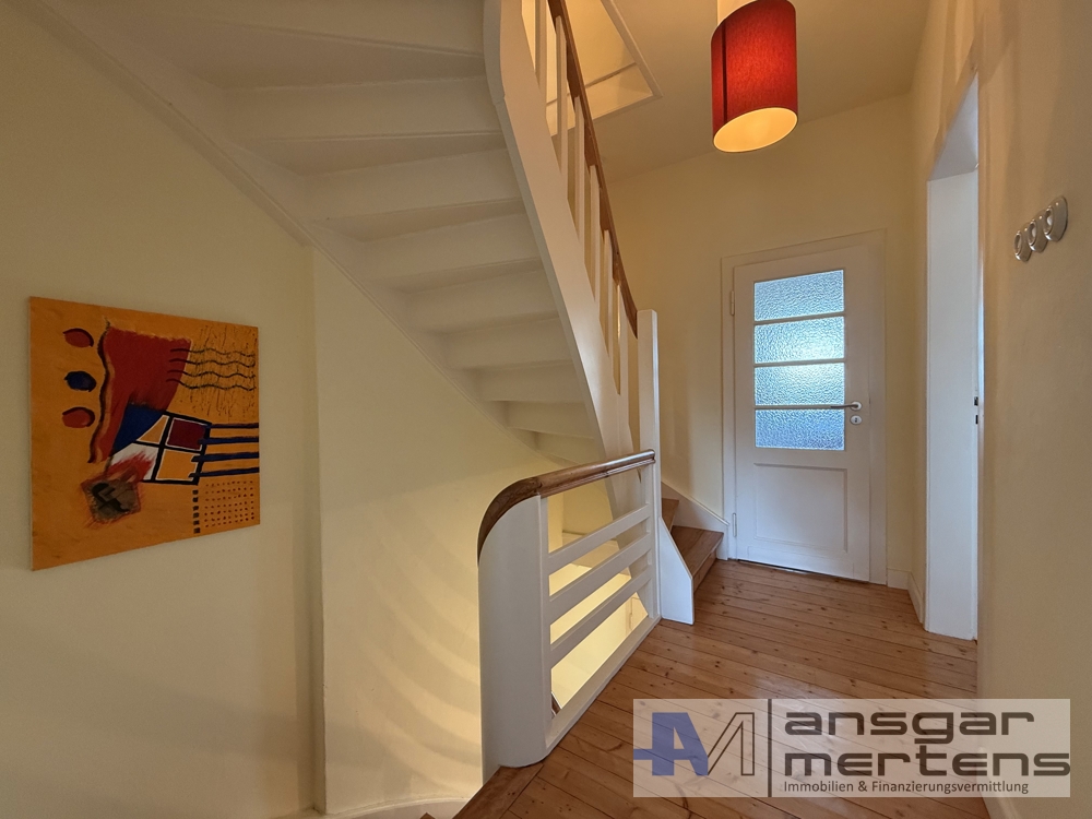 Willkommen in der einladenden Diele, von hieraus haben Sie Zugang in alle Bereiche Ihres Wohntraums: Neben einem Treppenaufgang zu den in den Obergeschossen gelegenen Zimmern erreichen Sie im Erdgeschoss das herrlich gemütliche & gleichzeitig üppige Wohn- und Esszimmer inklusive der angrenzenden halboffenen Wohnküche mit direkten Gartenzugang.