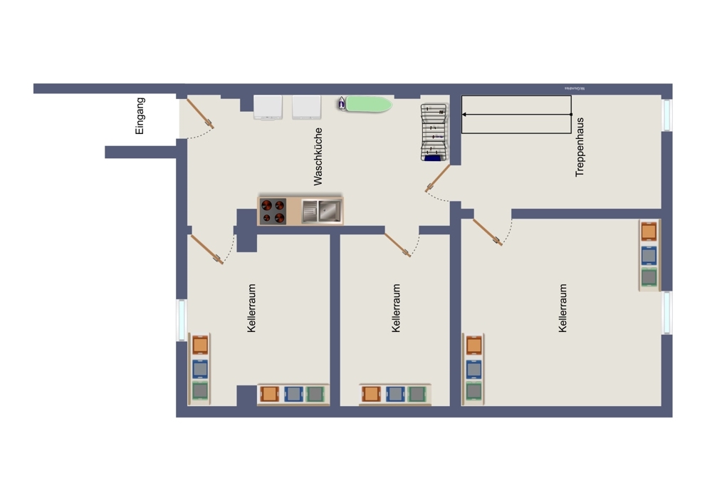 Das Reihenhaus ist vollunterkellert, es gibt 3 Kellerräume nebst Waschküche mit Gartenaufgang. Der Keller weißt baujahrstypische Feuchtigkeitsstellen aus.