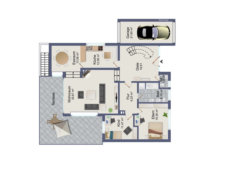 Direkt vor dem Wohnzimmer liegt die stilistisch überdachte Gartenterrasse. Der herrlich angelegte Garten garantiert Ihnen und Ihrer Familie pure Freizeiterholung! Den Souterrain erreichen Sie von der einladenden Diele über eine geschwungene Bogentreppe. Hier finden Sie den Hobbybereich, neben einem Hausarbeitsraum (Gäste) befindet sich dort ein großes Tageslichtzimmer, ideal als Büro, Spiel- oder Hobbyraum. Die großzügige Durchfahrtsgarage mit 2 Garagentoren vollendet das Platzangebot vollumfänglich!