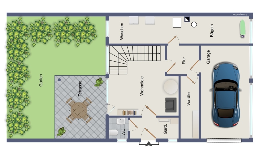 Die Immobilie ist nicht unterkellert, den Hauswirtschaftsraum inkl. Waschküche & Technik sowie den separaten Vorratskeller finden Sie im Erdgeschoss.
