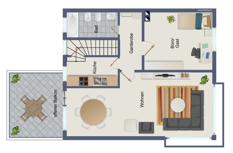 Ein herrlich trauter & gleichzeitig üppiger Wohn- und Essbereich mit Terrasse bilden hier den Familientreffpunkt! Ebenfalls finden Sie auf dieser Ebene ein Schlafzimmer, ein Tageslichtbadezimmer und die Küche, über die Sie dann das Treppenhaus zum Dachgeschoss erreichen.