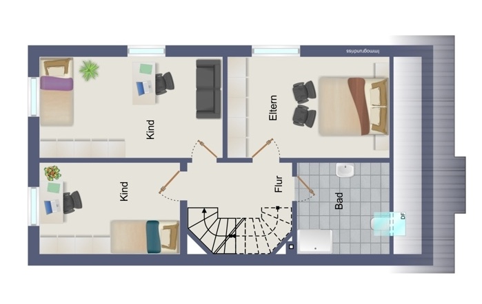 Vollendet wird die Einheit durch die im 1. Obergeschoss gelegenen Privaträume. Ein großes Schlafzimmer, zwei Kinderimmer und das morderne und geräumigen Tageslichtbadezimmer runden das Familienleben ab.