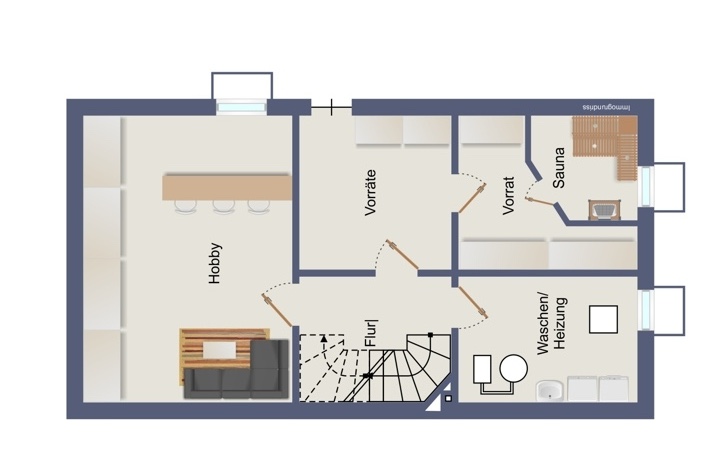 Die Immobilie ist vollunterkellert und umfasst einen großen Hobbykeller, einen Vorratskeller mit Sauna & Gartenaufgang und die Waschküche mit der Heizungsanlage.