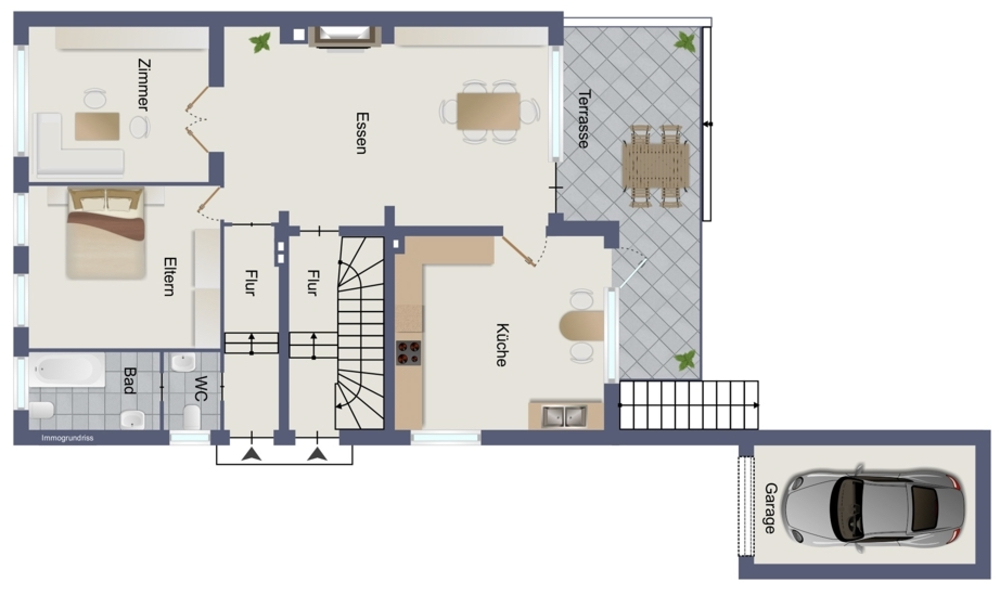 - Wohnung im Erdgeschoss: Garage, Terrasse + Rasenfläche